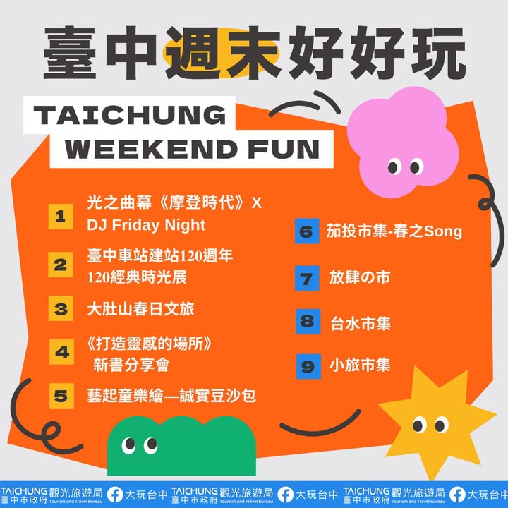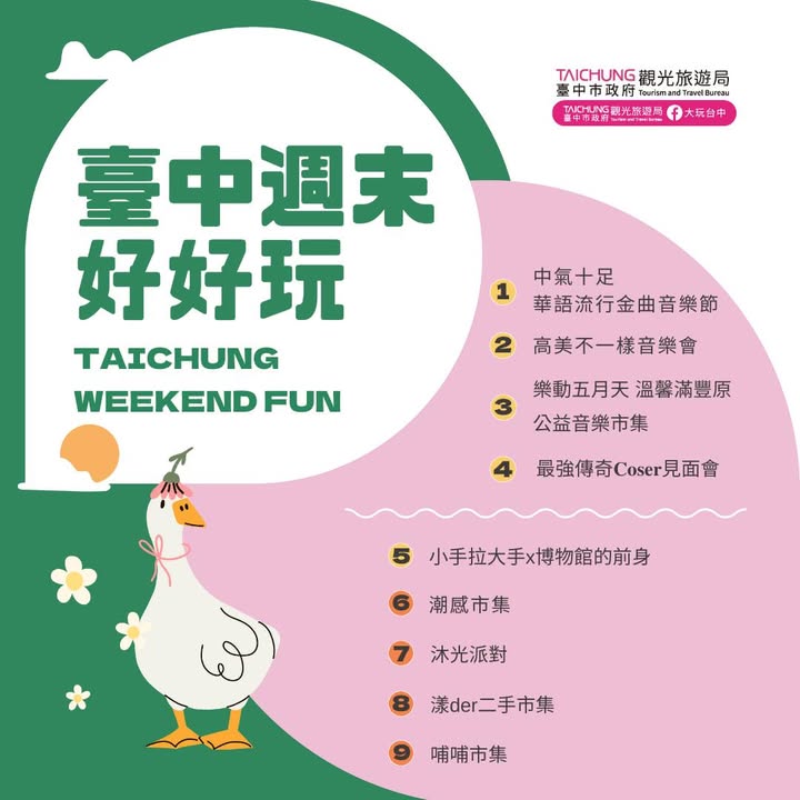 - \𝑻𝒂𝒊𝒄𝒉𝒖𝒏𝒈 𝑾𝒆𝒆𝒌𝒆𝒏𝒅 𝑭𝒖𝒏!/天气微凉,适合逛市集、听音乐, 把日子过成喜欢的样子。 不管是亲子放电还是好友相聚, 这个周末,我们在台中不见不散 活动|台湾庞克折返跑音乐节2025 12/6(六)-12/7(日) 11:00-22:00 台中洲际棒球场(台中市北屯区崇德路三段835号) 活动连结:https://reurl.cc/MMXm0v -------------------------------- 活动|缤纷台中移定幸福 12/6(六) 09:00–13:00 台中市新住民艺文中心前广场(台中市南屯区文心南五路一段331号,丰乐雕塑公园内) 活动连结:https://reurl.cc/nlLxDX -------------------------------- 活动|亲子爱地球 永续起步走音乐晚会 12/6(六) 18:00-20:30 福阳国民小学(台中市丰原区南阳路绿山巷83号) 活动连结:https://reurl.cc/GGKgvx -------------------------------- 活动|台中百业生活购物节 12/5(五)-12/8(一) 10:00-18:00 台中国际展览馆(台中市乌日区中山路三段1号) 活动连结:https://reurl.cc/MMyWOn -------------------------------- 活动|欣向町电影日 12/6(六) 17:30-19:30 欣向町森活园区 (台中市后里区甲后路二段 350 号) 活动连结:https://reurl.cc/k8rmYx -------------------------------- 展览| Input > Unknown 即日起至1/4(日) 周二至周日及国定假日 13:00-21:00 (每周一公休) 勤美术馆(台中市西区馆前路79号) 活动连结:https://reurl.cc/vK6GV1 -------------------------------- 市集|市集角落 12/6(六)-12/7(日) 12:00-21:00 PARK2 草悟广场(台中市西区英才路534号) 活动连结:https://reurl.cc/W8vyak -------------------------------- 市集|揪厝觅二手市集 圣诞限定场 12/6(六)-12/7(日) 11:00-17:30 文化部文化资产园区 雅堂馆(台中市南区复兴路三段362号B09) 活动连结:https://reurl.cc/la7lL6 -------------------------------- 市集|单细胞市集 12/6(六)-12/7(日) 12:30-20:30 诚品生活480号(台中市西屯区市政路480号) 活动连结:https://reurl.cc/Dboeve --------------------------------2025-12-05
