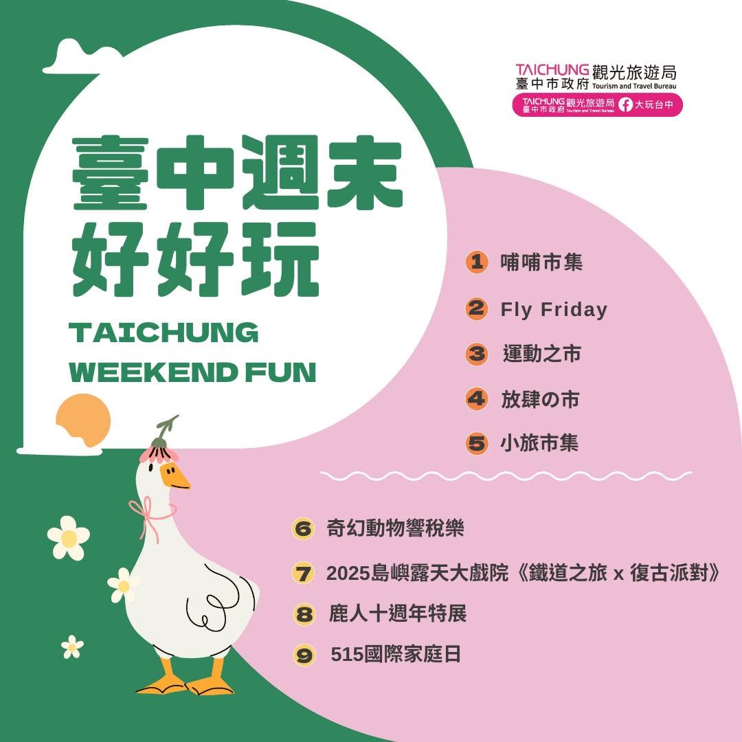 - \𝑻𝒂𝒊𝒄𝒉𝒖𝒏𝒈 𝑾𝒆𝒆𝒌𝒆𝒏𝒅 𝑭𝒖𝒏!/天气微凉,适合逛市集、听音乐, 把日子过成喜欢的样子。 不管是亲子放电还是好友相聚, 这个周末,我们在台中不见不散 活动|台湾庞克折返跑音乐节2025 12/6(六)-12/7(日) 11:00-22:00 台中洲际棒球场(台中市北屯区崇德路三段835号) 活动连结:https://reurl.cc/MMXm0v -------------------------------- 活动|缤纷台中移定幸福 12/6(六) 09:00–13:00 台中市新住民艺文中心前广场(台中市南屯区文心南五路一段331号,丰乐雕塑公园内) 活动连结:https://reurl.cc/nlLxDX -------------------------------- 活动|亲子爱地球 永续起步走音乐晚会 12/6(六) 18:00-20:30 福阳国民小学(台中市丰原区南阳路绿山巷83号) 活动连结:https://reurl.cc/GGKgvx -------------------------------- 活动|台中百业生活购物节 12/5(五)-12/8(一) 10:00-18:00 台中国际展览馆(台中市乌日区中山路三段1号) 活动连结:https://reurl.cc/MMyWOn -------------------------------- 活动|欣向町电影日 12/6(六) 17:30-19:30 欣向町森活园区 (台中市后里区甲后路二段 350 号) 活动连结:https://reurl.cc/k8rmYx -------------------------------- 展览| Input > Unknown 即日起至1/4(日) 周二至周日及国定假日 13:00-21:00 (每周一公休) 勤美术馆(台中市西区馆前路79号) 活动连结:https://reurl.cc/vK6GV1 -------------------------------- 市集|市集角落 12/6(六)-12/7(日) 12:00-21:00 PARK2 草悟广场(台中市西区英才路534号) 活动连结:https://reurl.cc/W8vyak -------------------------------- 市集|揪厝觅二手市集 圣诞限定场 12/6(六)-12/7(日) 11:00-17:30 文化部文化资产园区 雅堂馆(台中市南区复兴路三段362号B09) 活动连结:https://reurl.cc/la7lL6 -------------------------------- 市集|单细胞市集 12/6(六)-12/7(日) 12:30-20:30 诚品生活480号(台中市西屯区市政路480号) 活动连结:https://reurl.cc/Dboeve --------------------------------2025-12-05