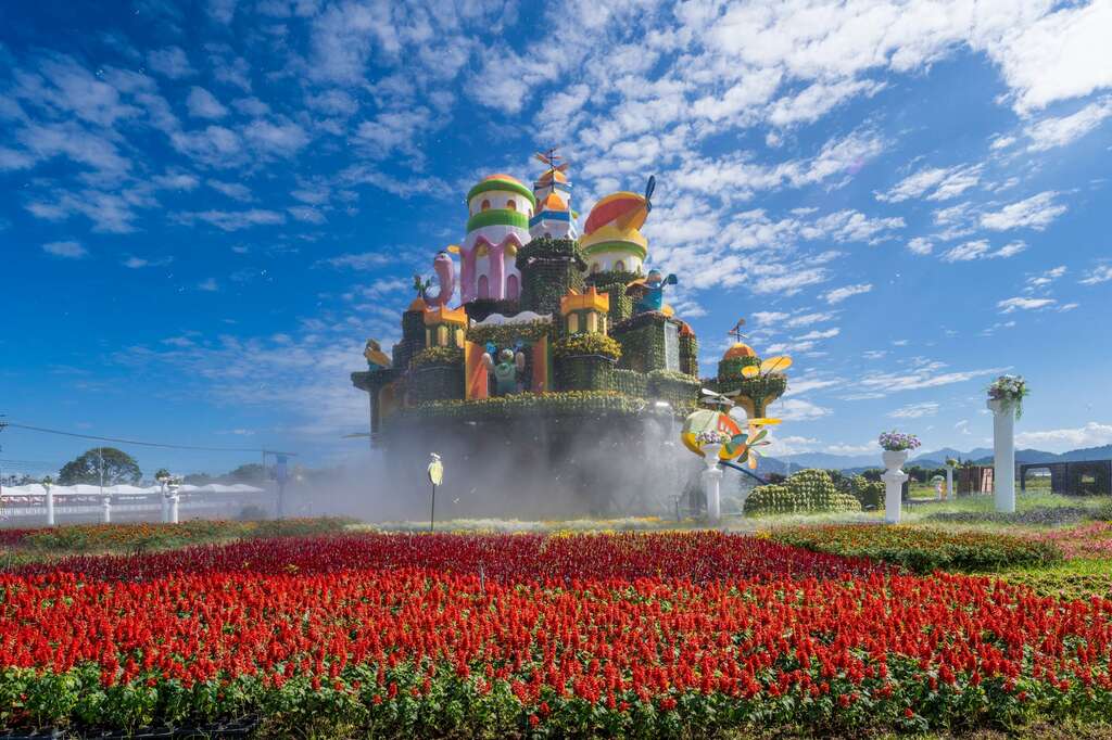 2023台中国际花毯节打造全台首座漂浮於空中的花卉城堡–漂浮花都,透过隐喻的方式将新社的自然生态、农业及人文等元素,设计为守护新社的三大守护神,一起将新社打造成生气盎然的模样,游客来到这里,彷佛走进一个充满理想的乌托邦。