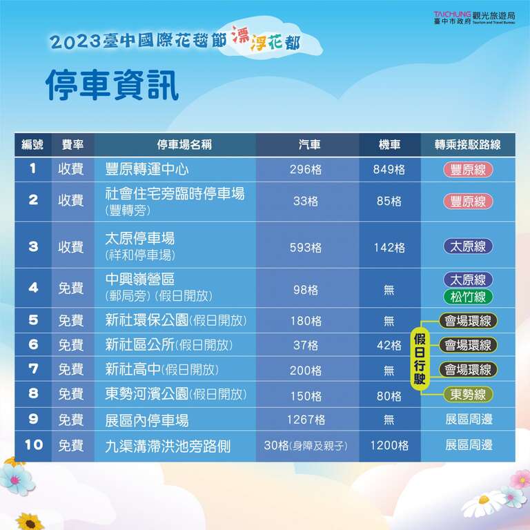 丰原线、太原线、松竹线、东势线及会场环线(展区巡回路线)5条免费接驳路线,平假日皆有接驳车提供服务,前往花海会场服务时间自上午8时至下午2时30分;参观完花海後,回程的接驳车服务时间自上午10时至下午5时,其中东势线及会场环线为假日特别加开的接驳线,请民众多加利用大众运输工具前往会场。
