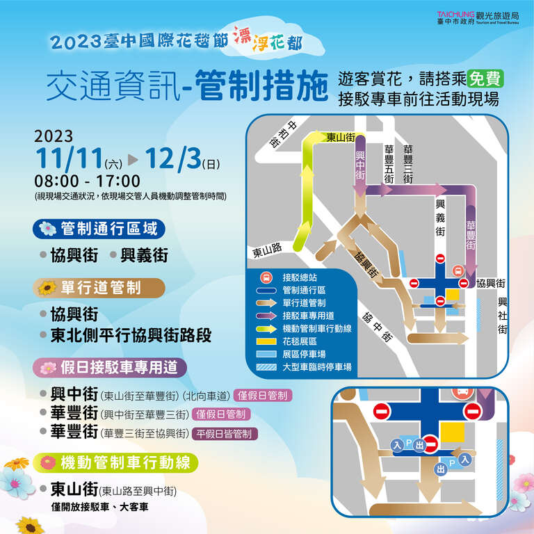 活动现场每日上午8时至下午5时实施交通管制,欢迎民众多利用大众运输工具前往。