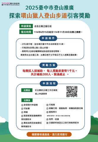 ▶️说明|规划与旅行业者推出和平区「2天1夜」登山套装游程,游程包含环山猎人登山步道 ,并须聘用1位当地导览员或部落耆老带队解说 ,且须安排於台中市合法旅宿住宿至少1夜 ,即可获得引客奖励。
