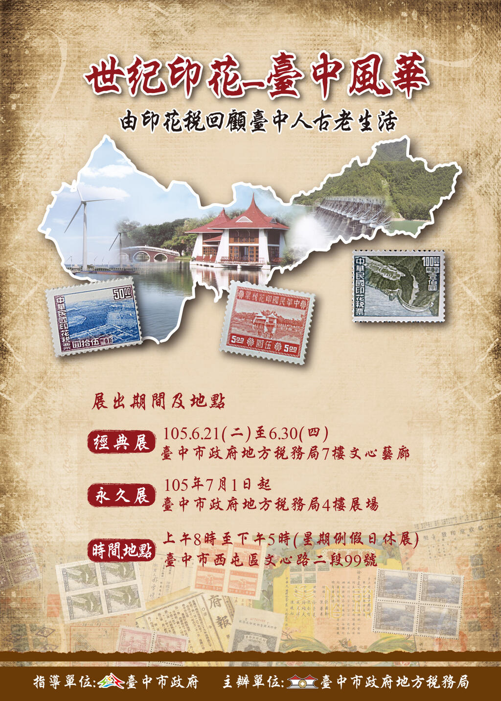 台中市政府地方税务局自105年6月21日起举办105年度「世纪印花-台中风华」展览,欢迎踊跃参观。