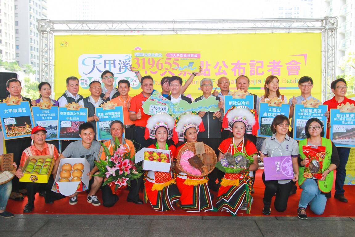 为了推广大甲溪沿岸自然生态及人文历史,台中市政府观光旅游局举办「大甲溪观光文化季」,配合活动推出「大甲溪10大景点」网路票选,全台共投下超过30万张票,加上专家评选,今(5)日在市长林佳龙的见证下举行记者会公布票选结果,前10大景点包括:高美湿地、武陵农场、东丰─后丰铁马道、大甲镇澜宫、谷关风景区、大雪山森林游乐区、梨山风景区、泰安铁道文化园区、石冈坝、新社白冷圳。