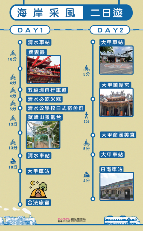 适合对象亲子、单车族旅游天数2日游旅游季节春、夏、秋交通工具铁路、市公车、单车行程类型历史巡礼、海洋游趣文章內容定位点台中海线精华全收录!百年车站、名刹古蹟、经典必吃美食!两天一夜深入探访大甲清水双镇风情! 继续阅读