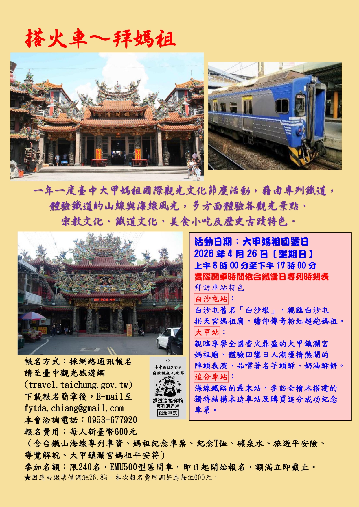 「2026臺中媽祖國際觀光文化節」結合一年一度臺中大甲媽祖國際觀光文化節慶活動,促進全國民眾前來臺中市觀光旅遊,藉由專列鐵道,同時體驗鐵道的山線與海線風光,將臺中境內觀光景點結合整體行銷,邀請民眾報名參與,多方面體驗各觀光景點、宗教文化、鐵道文化、美食小吃及歷史古蹟特色。