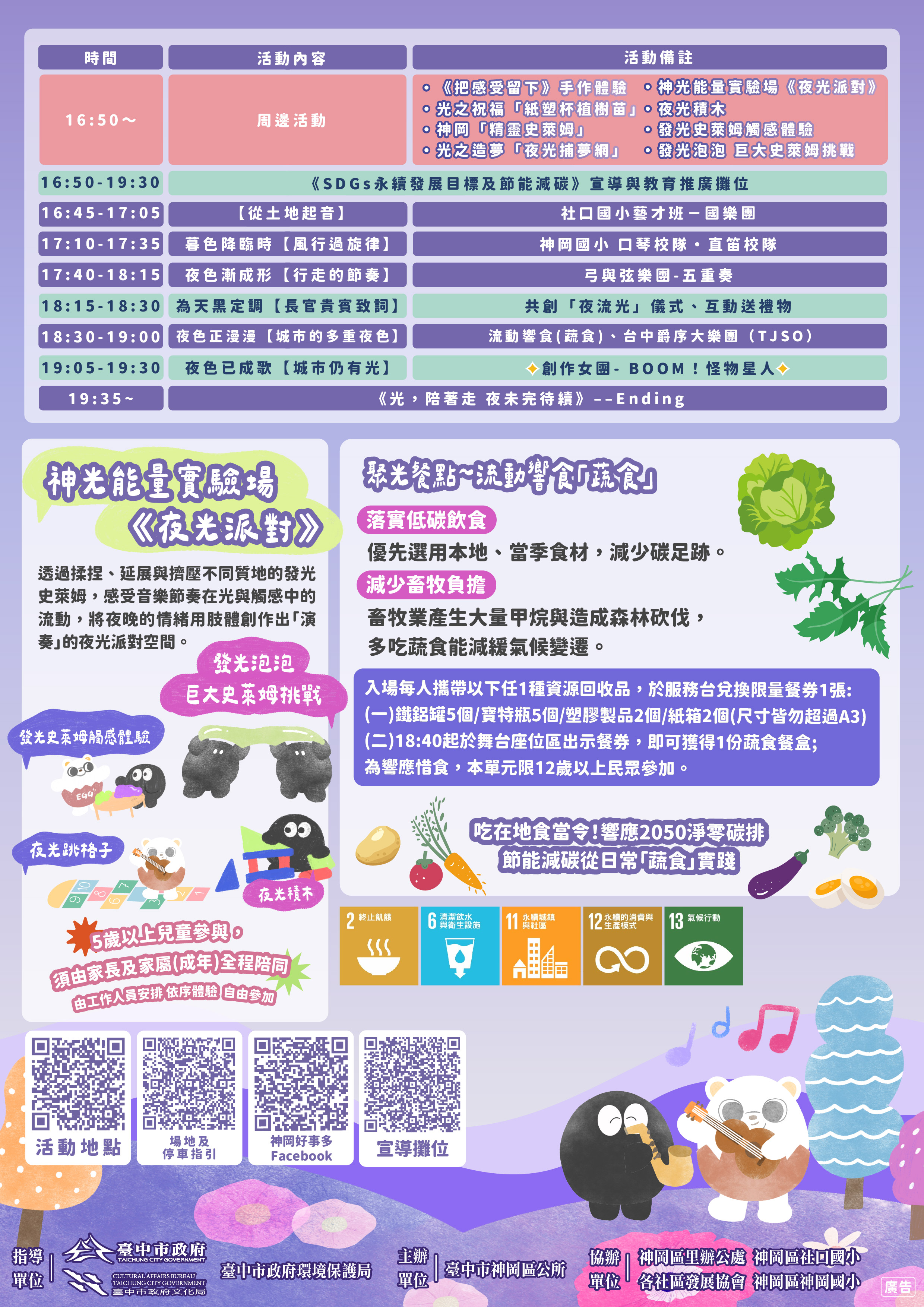 4、 提升環境教育參與感推出「把感受留下」單元,包括:光之造夢-夜光捕夢網、尋找神岡精靈史萊姆、光之祝福-紙塑杯植樹苗等手作體驗,透過創作過程傳遞資源循環與永續發展概念。