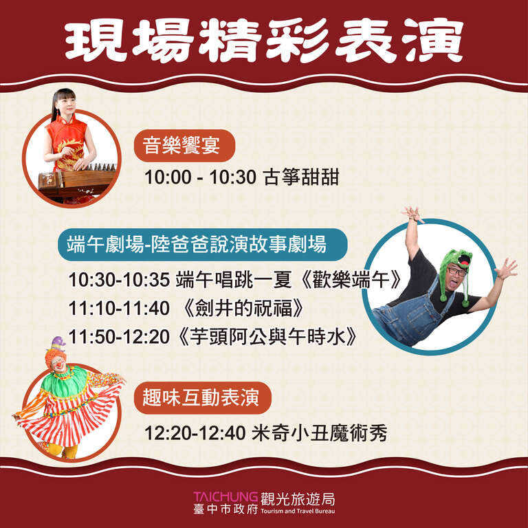 觀旅局表示,今年活動以「蛇龍午 慶端午」為主題,取其諧音為「什麼都有」;也寓意著「蛇年到,心想事成、年年有餘」。每年最搶手的限量午時水紀念瓶,也會在5月31日端午節當天上午10時開始發放號碼牌,限量500份,發完為止,民眾可免費領取。今年也再次邀請廣受親子喜愛的「陸爸爸說演故事劇場」演出,融合傳統與創新的原創表演,帶領大小朋友認識端午習俗與劍井取午時水的文化。除此之外,現場也有立蛋體驗、立蛋比賽,以及多元的藝文表演,讓民眾感受濃厚的節慶氣息。