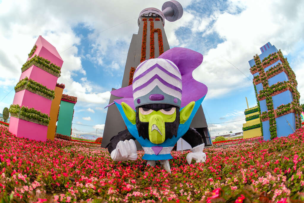 觀旅局長陳美秀表示,今年新社花海花毯節以「動畫元素 × 花卉藝術 × 永續共創」為策展核心,將備受喜愛的飛天小女警經典元素與在地花卉巧妙融合。現場共有15個裝置及角色立牌,是歷年最多。主花毯高18米、直徑60米,最高處聳立魔人啾啾基地,每半小時自動展演泡泡、水霧與機械動態,成為遊客爭相拍照的焦點。園區更設置場景裝置,如盪鞦韆與甜甜圈店,讓大小朋友都能身歷其境,親自參與冒險。