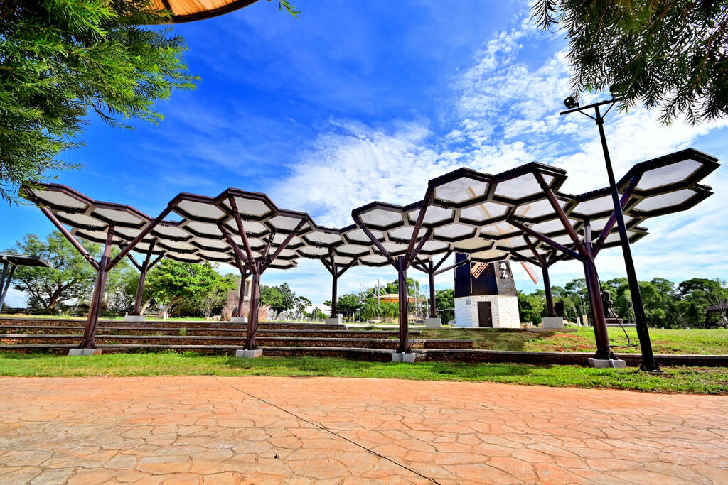 觀旅局說明,此次工程亮點包含多項景觀與設施更新,其中雕塑公園新設蜂巢造型遮陽棚,造型呼應既有鐵砧山標誌系統,不僅提供休憩遮陽功能,也成為園區新的拍照打卡亮點;成功路沿線擋土牆進行景觀美化,運用石板、卵石骨材及岩面磚等多樣建材混合拼貼,呈現頭嵙山地層特色與土壤色況,並融入灰面鵟鷹、五色鳥與狗花椒等在地生態意象,讓道路景觀更具故事性與地方辨識度;山頂新設觀景台,提供遊客駐足欣賞大甲地區市景、西海岸線、平原風光與晚霞景致;此外,成功路部分路段同步新增人行系統,優化人車動線,提升行走安全性,並強化整體景觀視覺效果。