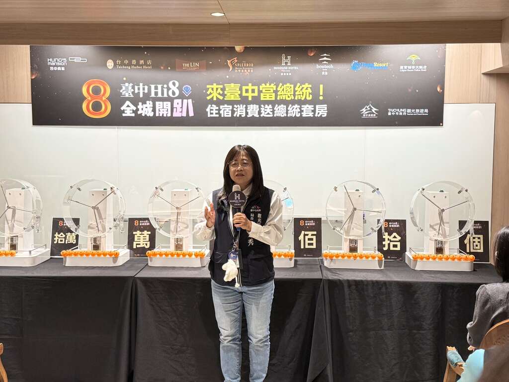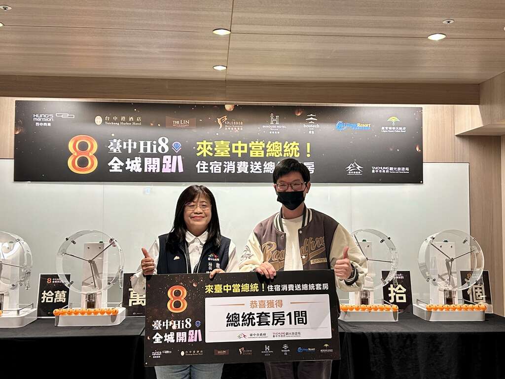 觀旅局補充,「來台中住宿消費送總統套房」系列活動後續將於1/28林酒店、2/9金典酒店接力辦理,並於觀旅局臉書粉絲專頁「大玩台中」直播,持續以多元行銷方式推廣台中觀光,歡迎民眾安排來台中旅遊住宿,享受優質旅宿服務,感受城市魅力。誠摯邀請全國民眾把握「台中Hi8全城開趴」期間規劃台中之旅,入住台中旅宿、登錄發票參加抽獎,為旅程增添更多期待與驚喜(台中嗨8 全城開趴活動官網:https://www.taichung.gov.tw/hi8 )。