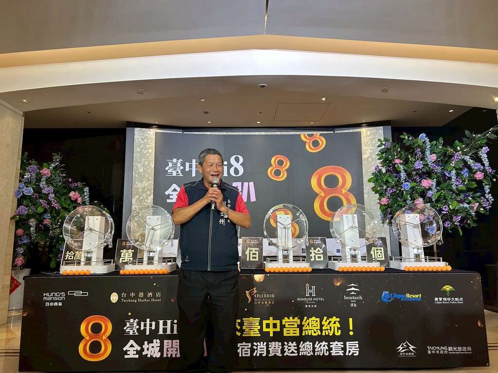 台中市觀旅局積極推動「台中Hi8 全城開趴」系列活動,今(9)日於金典酒店舉行「來台中當總統」最終場抽獎儀式,由副市長鄭照新等貴賓抽出 2 名總統套房得主。鄭副市長表示,在「台中Hi8全城開趴」氛圍與即將登場的中台灣燈會強大號召下,目前台中各大旅館的春節(2/14-2/21)平均訂房率已近6成並持續攀升中,數據六都第一!將台中旅遊熱度自去年底延伸至新春假期。