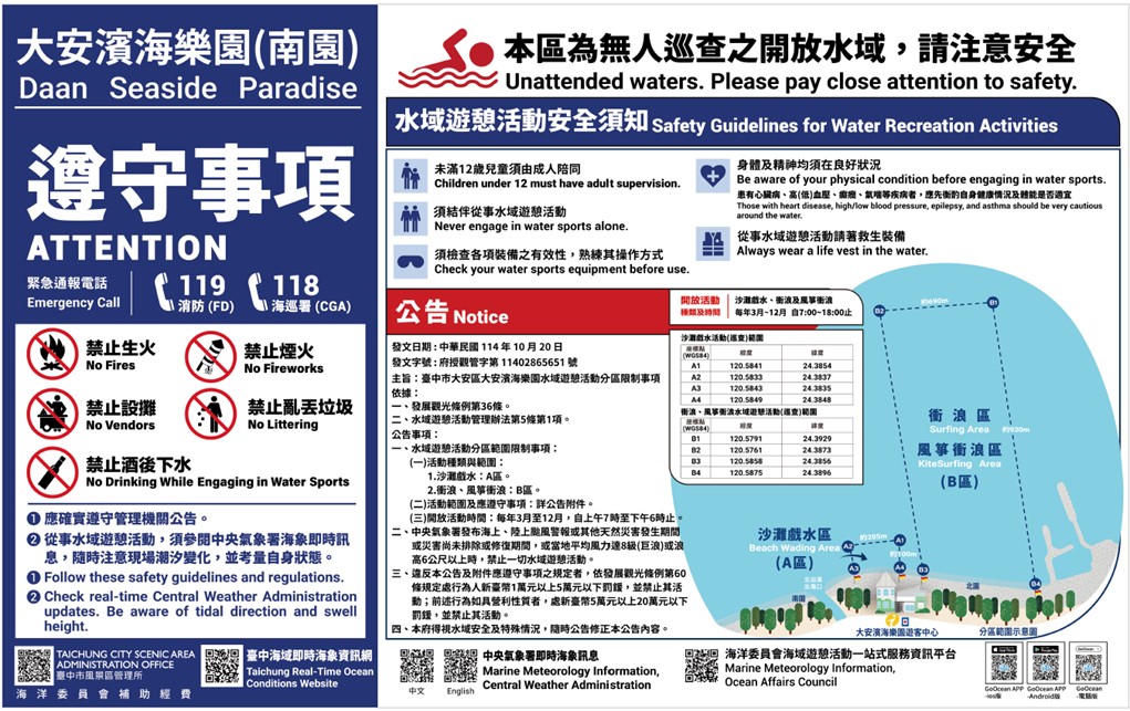 觀旅局長陳美秀指出,市府配合行政院「向海致敬」政策,持續推動民眾「知海、近海、進海」,並於去(114)年10月20日公告大安濱海樂園海域轉型為「開放式水域」,透過制度完善與安全配套,讓親海活動更加自由也更有保障。為讓民眾安心親海、放心戲水,市府建置「台中海域即時海象」資訊系統,提供民眾更即時的海象資訊以評估因應戲水安全。