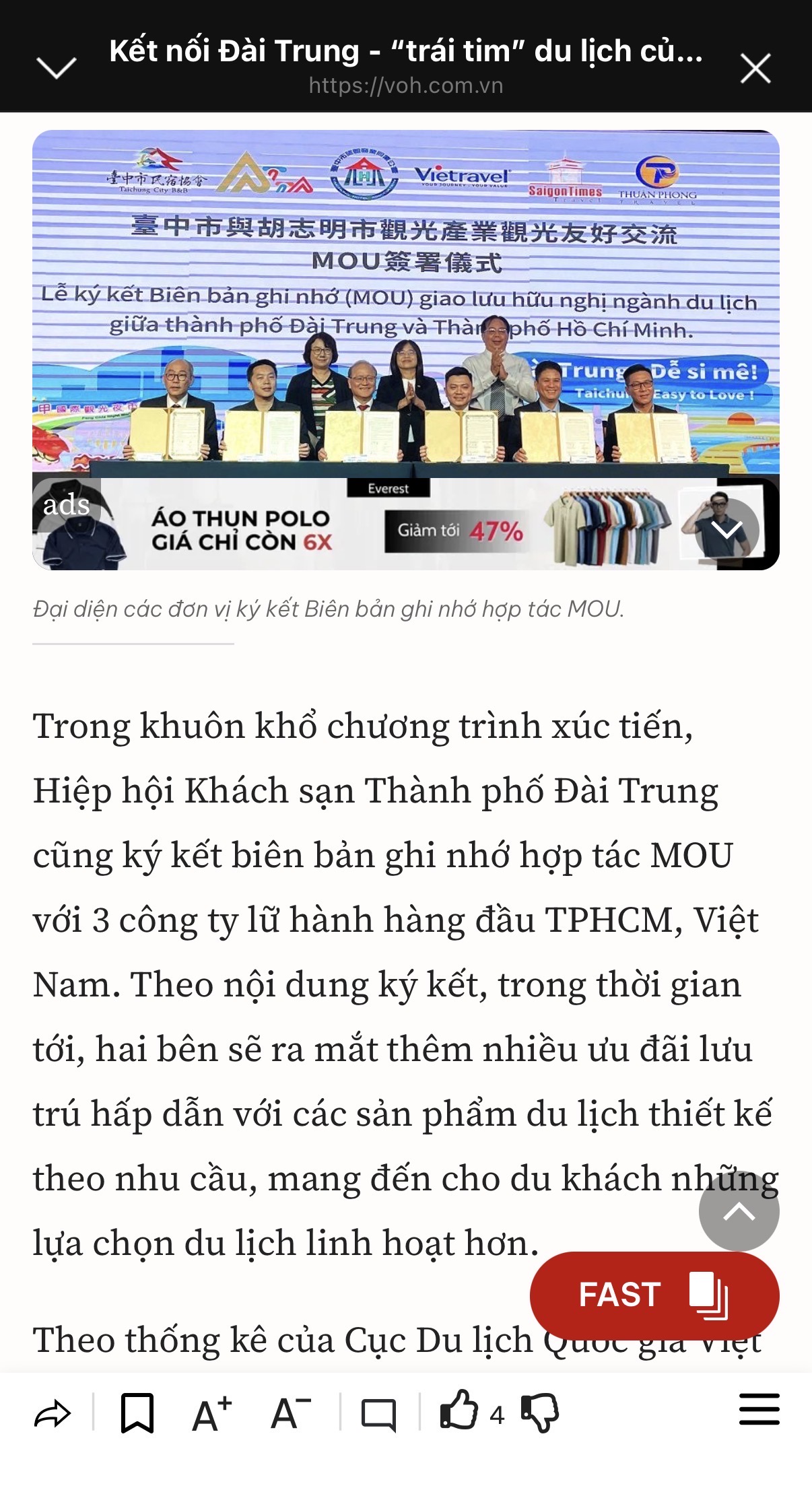 陳局長補充,此行重要成果之一為促成合作備忘錄(MOU)簽署,由台中市旅館商業同業公會、台中市民宿協會及台中市旅行商業同業公會,與胡志明市3大旅行社共同完成簽署,象徵雙方建立更具制度化與長期性的合作關係。透過公協會平台整合住宿與旅遊產品資源,未來將推出更具吸引力的行程方案與優惠內容,提升越南旅客赴台中旅遊的便利性與意願。