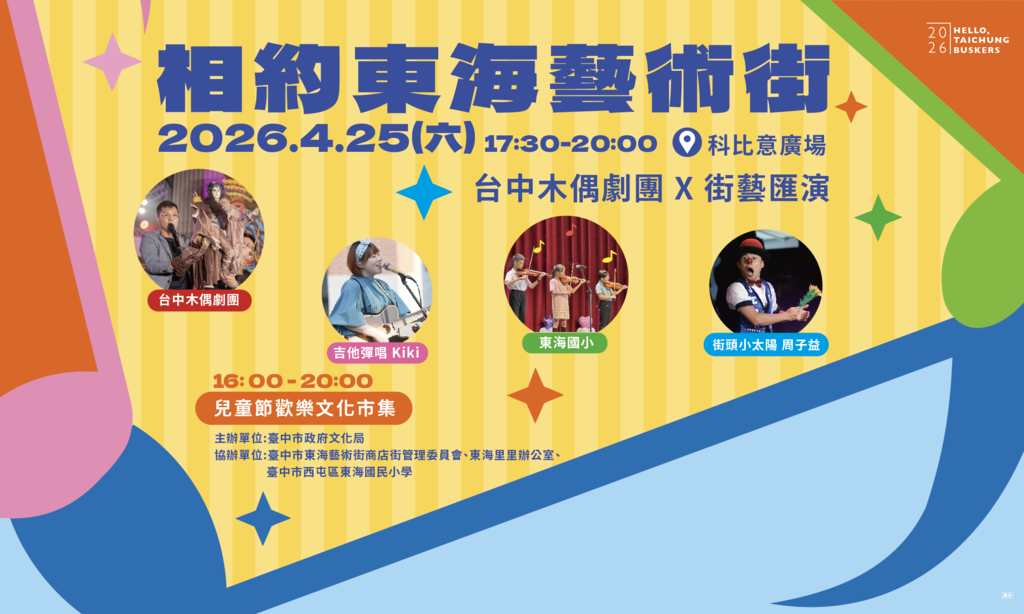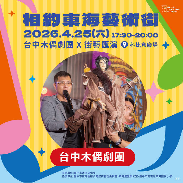 115年4月25日(星期六)相約東海藝術街「科比意廣場」,感受木偶武俠金光戲、街頭表演、音樂的藝術饗宴!除了精彩的演出,還有特色文化市集等你來玩~
