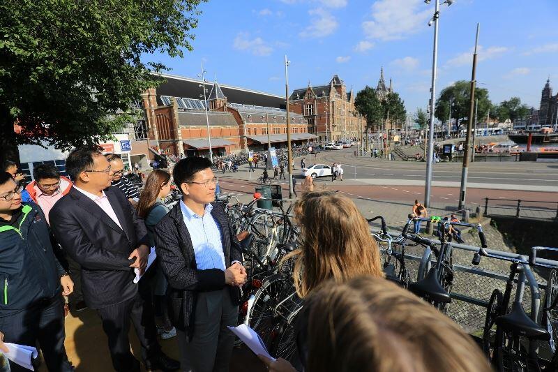 Cornelia Dinca帶領市府團隊參觀火車站周邊一座自行車停車塔,三層樓建築可停放約3千台自行車,她表示,火車站約有一半乘客騎自行車前來,因此周邊的自行車停車需求很大,目前阿姆斯特丹已有1萬格自行車位,但仍不夠,目標是2030年建構2萬2千格自行車位。