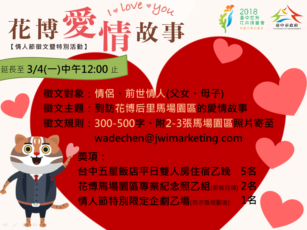 感謝大家踴躍參加花博愛情故事徵文活動,許多民眾反映,想趁228連假期間,與另一半共遊花博園區、順便拍照參加徵文,為了避免遺珠之憾,主辦單位特地將徵文截止日延至連假後3月4日中午12點,歡迎民眾連假期間,與另一半牽手逛花博,回味戀愛甜蜜滋味、寫下美好回憶,踴躍參加投稿!