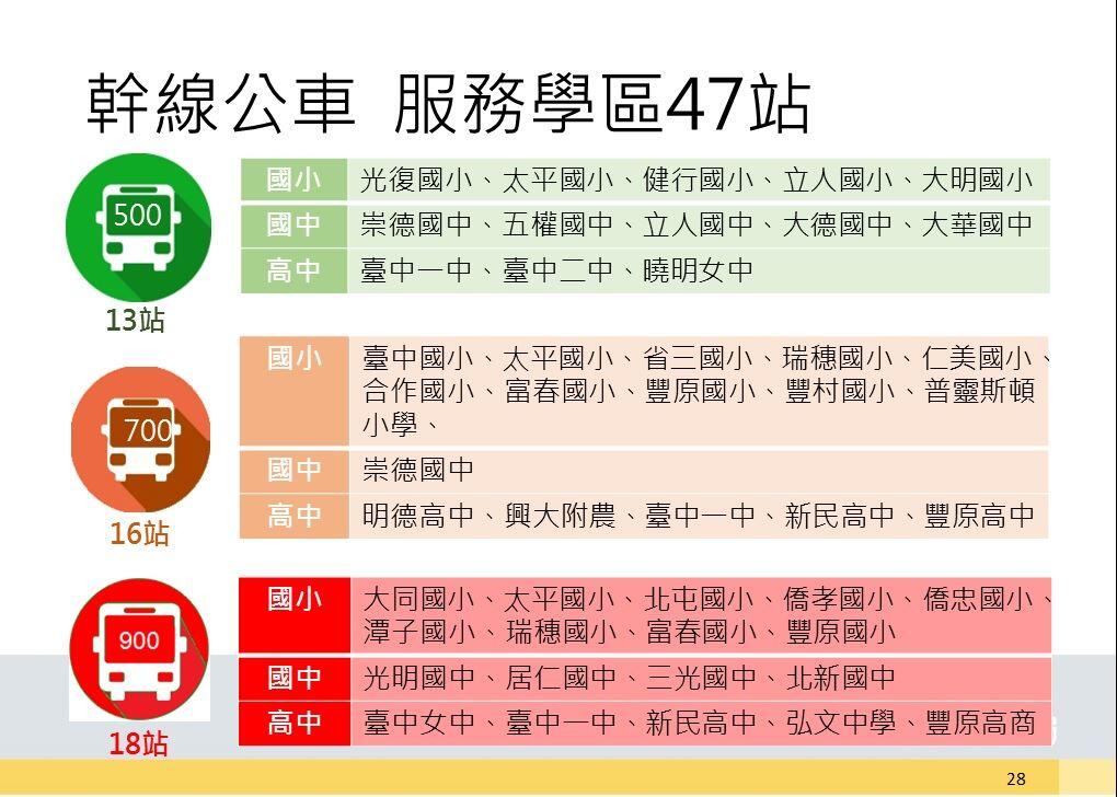 台中市政府新闢幹線公車500、700、900路,分別行走中清路、崇德路與台三線,往返豐原、大雅與台中火車站,採用只停大站的「跳蛙式」停靠,並增停沿線學校,於上下學時間行駛,相較原路線減少一半停靠站數,一趟可節省20分鐘時間,預計從今年3月1日上路。