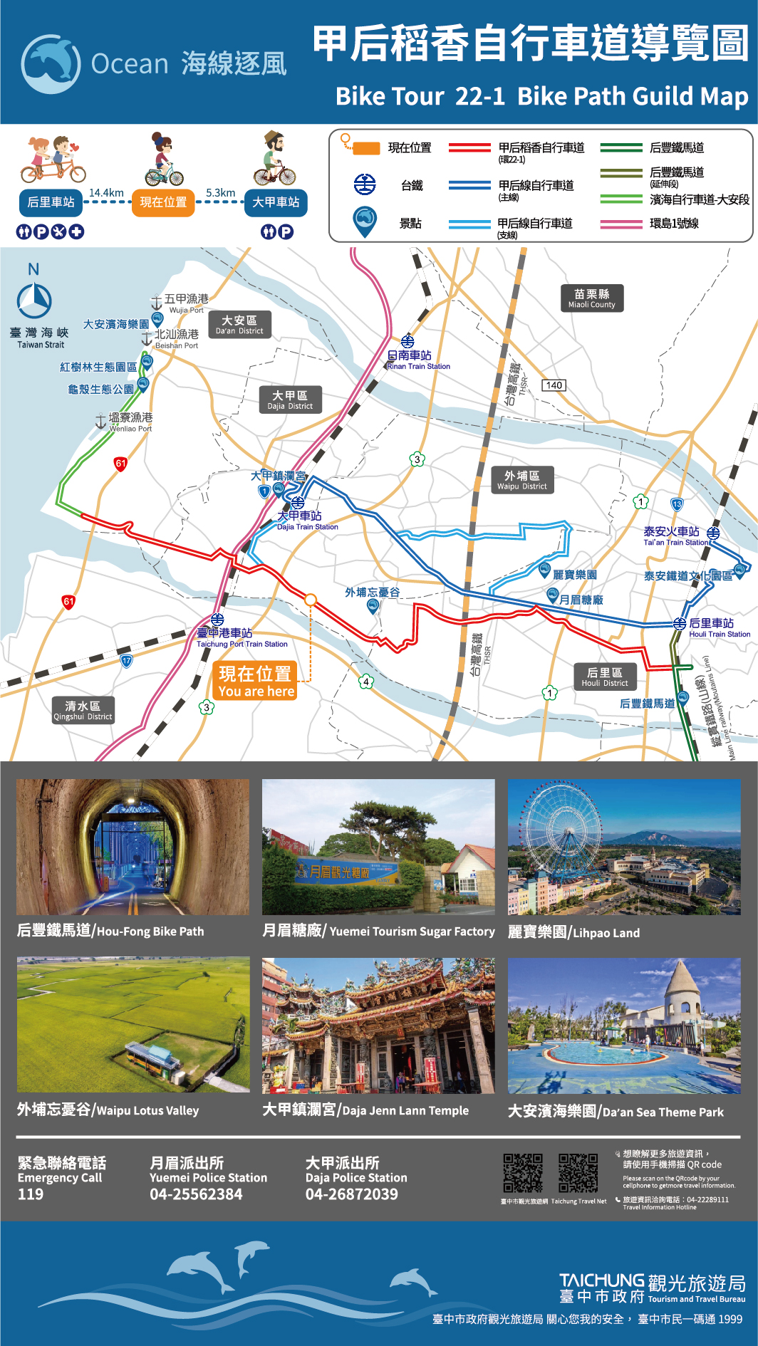 觀旅局說明,近期完成全長21公里的「甲后稻香自行車道」改善工程,內容包含改善路線導引標誌標線、鋪面更新破損路面、設置造型廊架觀景平台,以及施作箱涵引道連接前期堤頂自行車道,串聯后里往西經外埔、大甲至大安,以及前往大甲車站、后里車站的自行車道路網,讓民眾騎乘自行車從河堤上俯瞰,田園風光盡收眼底。
