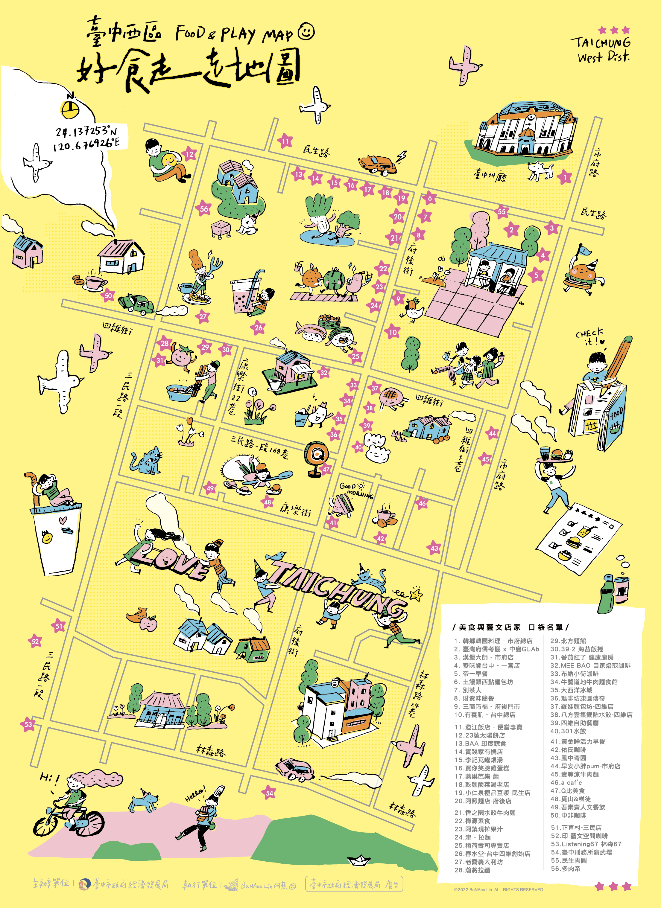 經發局指出,這次與知名創作家「阿蕉」合作,整合西區特色美食店家,用生動插畫方式取代傳統冗長的店家介紹資訊,並將每個店家用簡單可愛的圖案標示在地圖上,趣味又清楚明瞭的設計希望引起民眾共鳴,歡迎各地遊客到西區體驗藝文美食魅力之旅。
