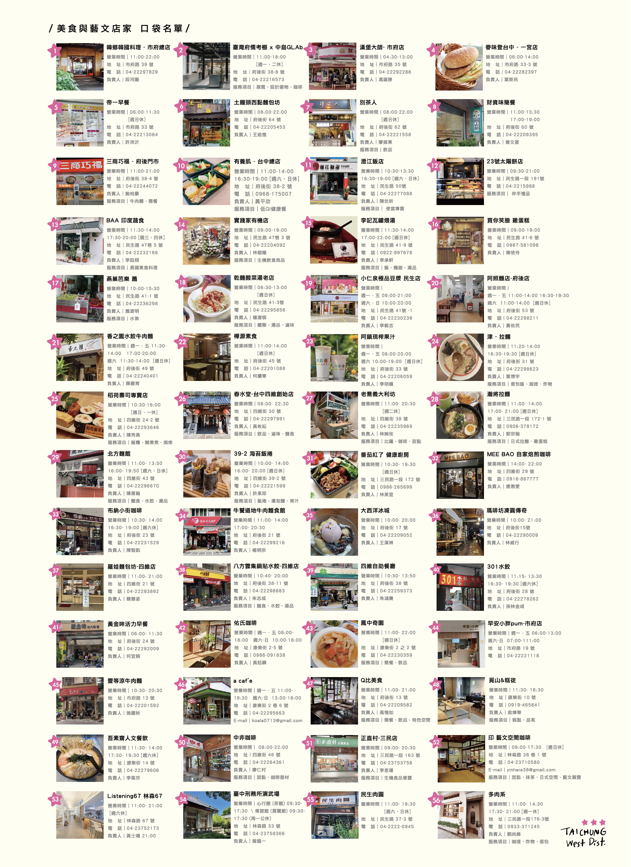 經發局指出,「台中西區好食走一走」地圖以西區府後街為中心,盤點56處在地美食店家資訊,包括壹等涼牛肉麵、珍奶發源地-春水堂創始店、阿鎮現榨果汁、大西洋冰城、四維自助餐、北方麵館、土饅頭西點麵包坊、財資味簡餐、民生乾麵酸菜湯老店、民生肉圓、中非咖啡、韓香韓國料理、樺源素食及吾素齋人文餐飲等,都是在地老饕及舊市府員工熟知的美食老店,未來也將搭配踩線行銷活動,帶動疫後西區舊城商機。