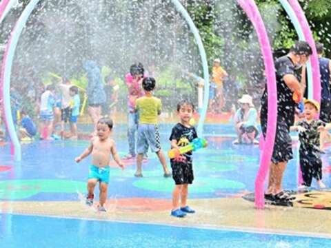 觀旅局表示,戲水區內有水霧水幕噴水設施、隧道噴泉、火山噴泉、葉子噴柱及2座噴水槍等戲水設施,一旁也貼心設置驛站供民眾更衣淋浴,大幅提升親子使用的安全及舒適性,這些精彩的設施既能讓小朋友玩得開心,也為大人們提供一處避暑放鬆的好地方。