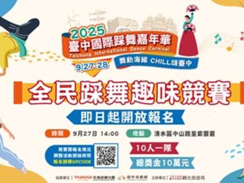 「2025台中國際踩舞嘉年華」將於9月27日至28日於清水熱鬧登場,台中市府觀旅局表示,活動於今年邁入第10屆,延續「街道就是舞台」的精神首度移師海線辦理;此外,今年為第三年舉辦「全民踩舞趣味競賽」,總獎金達10萬元,邀請民眾組隊上街熱舞,即日起開放報名。