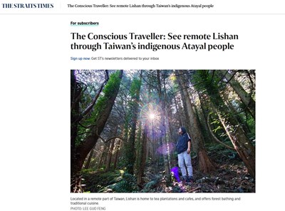 觀旅局長陳美秀表示,在《The Conscious Traveller: See remote Lishan through Taiwan’s indigenous Atayal people》一文中,Wendy Ng 形容梨山為「最神秘的地方」之一,文中分享了她在梨山與泰雅族原住民的互動經歷,並提及當地茶園、森林浴與部落文化。陳局長指出,梨山擁有豐富的自然環境,為讓旅客更容易親近山林,觀旅局打造環山獵人登山步道,該步道沿線融入泰雅族的文化元素,設置具有特色的休憩空間,歡迎旅客走訪體驗。(專欄連結:https://www.straitstimes.com/life/travel/the-conscious-traveller-see-remote-lishan-through-taiwans-indigenous-atayal-people)。