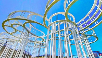 作品周邊還安裝LED水底投射燈,夜間時利用燈光變化營造出不同的藝術光雕氛圍;另一座作品「到海邊坐坐」以流動的水紋為構思,利用不鏽鋼線條扭轉及直線組合成如水紋柔美的造型,底座以立體曲面的馬賽克拼貼成座椅,象徵海上的浪花,當遊客坐在座椅向上仰望時,彷彿置身海底看著波光粼粼的海面,是一處讓遊客與公共藝術作品互動的休憩場所。