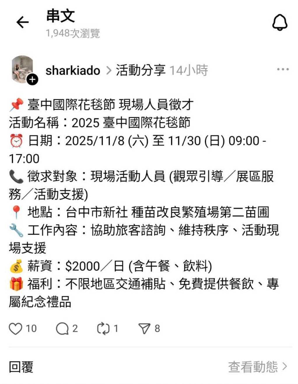 「2025年台中國際花毯節」即將於11月8日登場,每年皆迎來觀光熱潮,近期發現有不肖份子於網路上假冒花毯節徵才詐騙,市府觀光旅遊局今日發布以下嚴正聲明:為維護民眾權益及活動安全,鄭重提醒社會大眾,近期於網路社群平台(如Threads、Instagram等)出現多則假冒「2025台中國際花毯節」現場人員徵才的貼文,均為不實詐騙訊息,特此澄清並呼籲民眾,切勿聽信來路不明的招募資訊,以免個人權益受損。