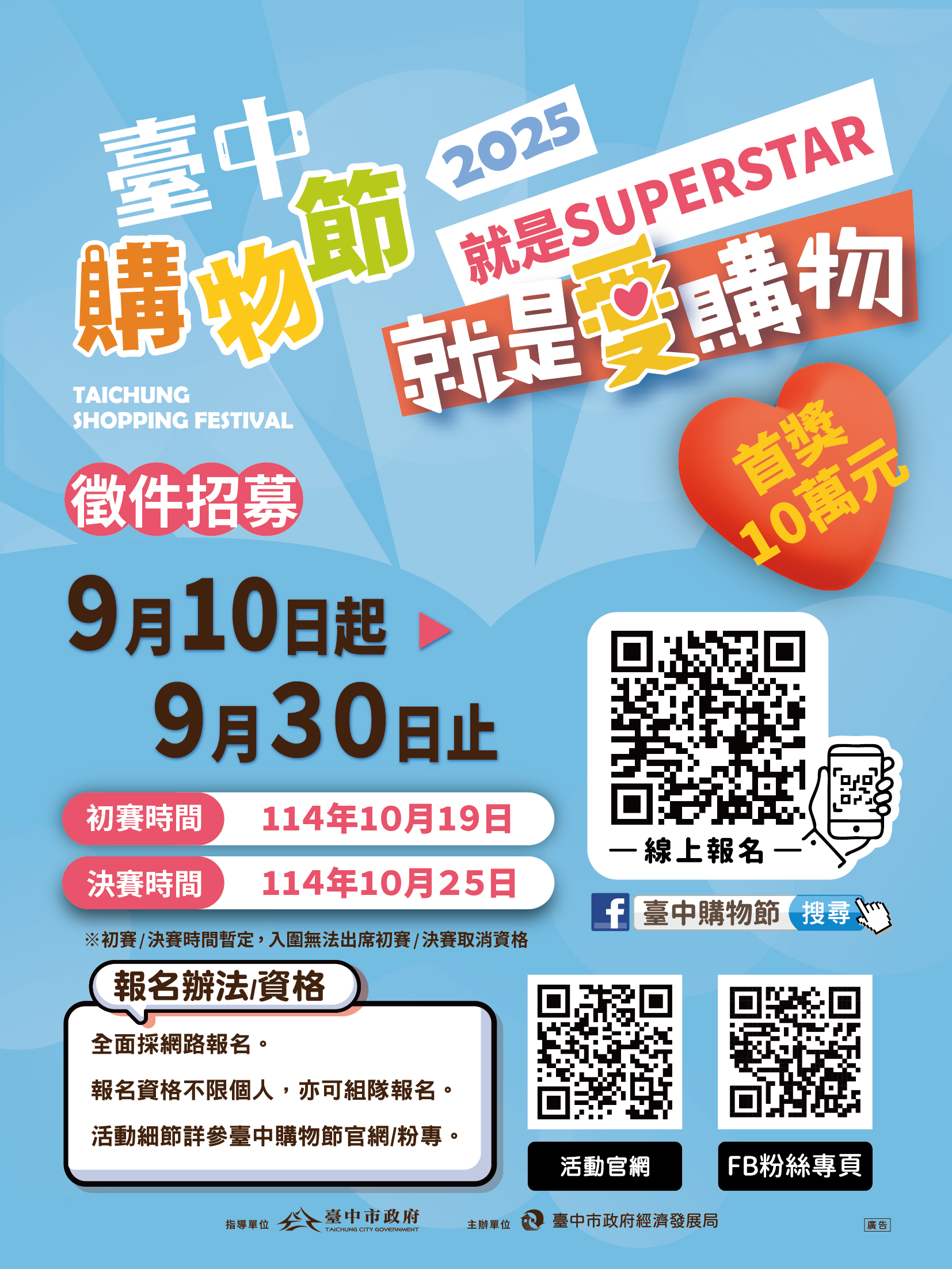 「2025臺中購物節-就是愛購物」徵件競賽活動開跑,參加民眾只要秀出你對臺中購物的熱愛,呈現內容、形式不限,惟作品須為參賽者可於舞台展演、闡述之形式為主,並切合競賽主題。投稿請以1,000字以內之中文文字概述創作理念,內容不得違反善良風俗及含不雅文字。