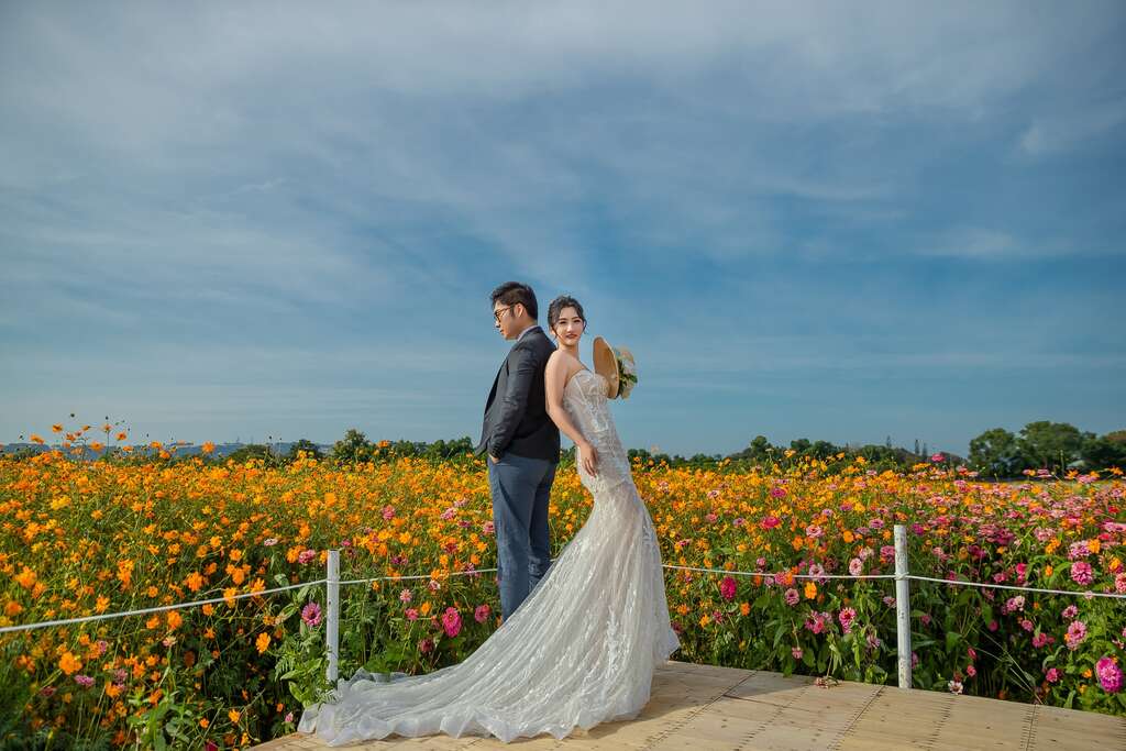 婚紗拍攝知名婚攝業者「威廉王經典婚紗」今(27)日就帶領一對新人入園拍攝,畫面唯美動人,在蔚藍天空與繽紛花海的映襯下,為兩人的愛情留下最浪漫的見證。觀旅局長陳美秀表示,除了婚紗拍攝浪漫吸睛,新社的「九庄媽」更具有獨特的民俗傳統,邀請大家來新社「賞花追媽祖,幸福一輩祖」。