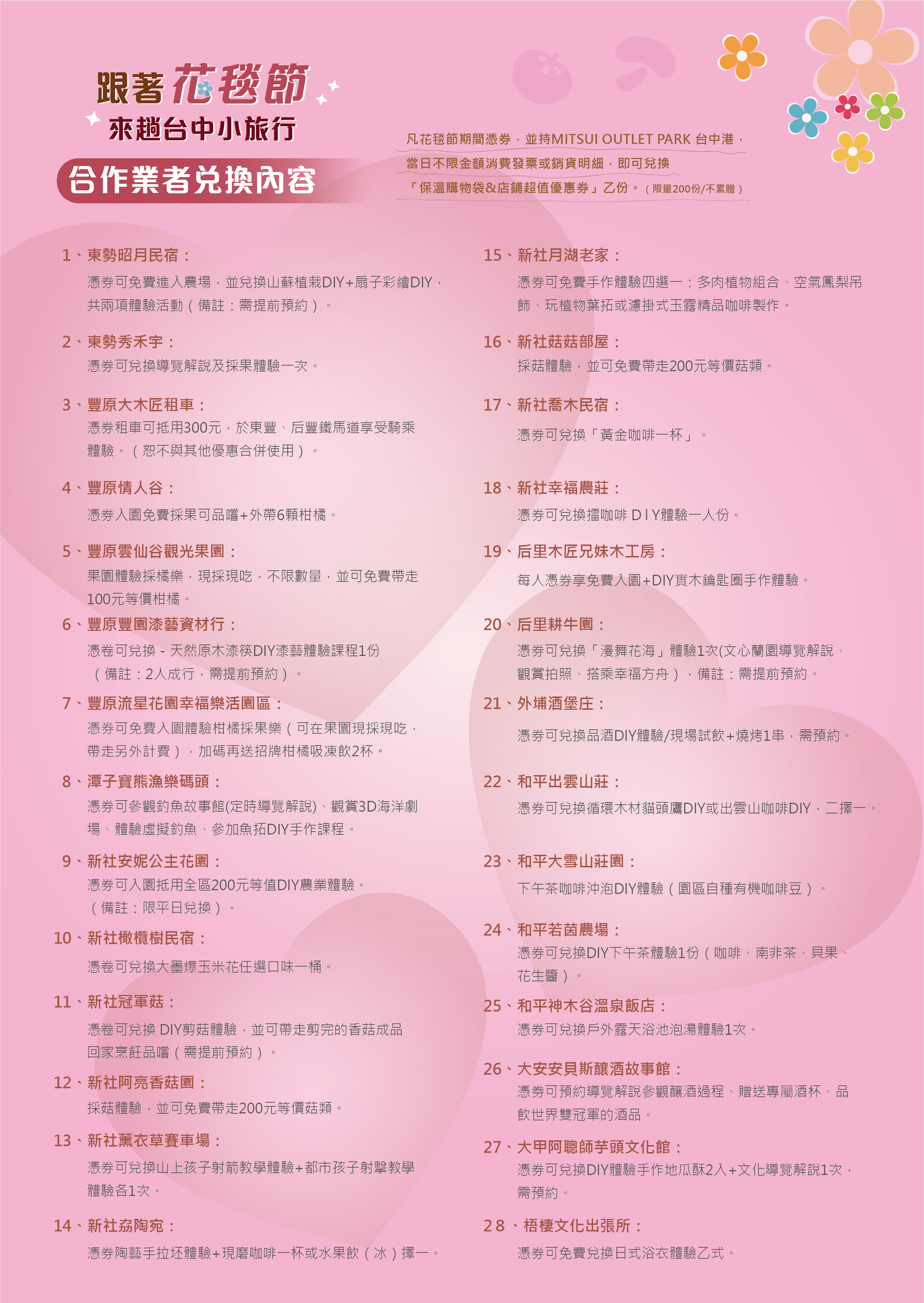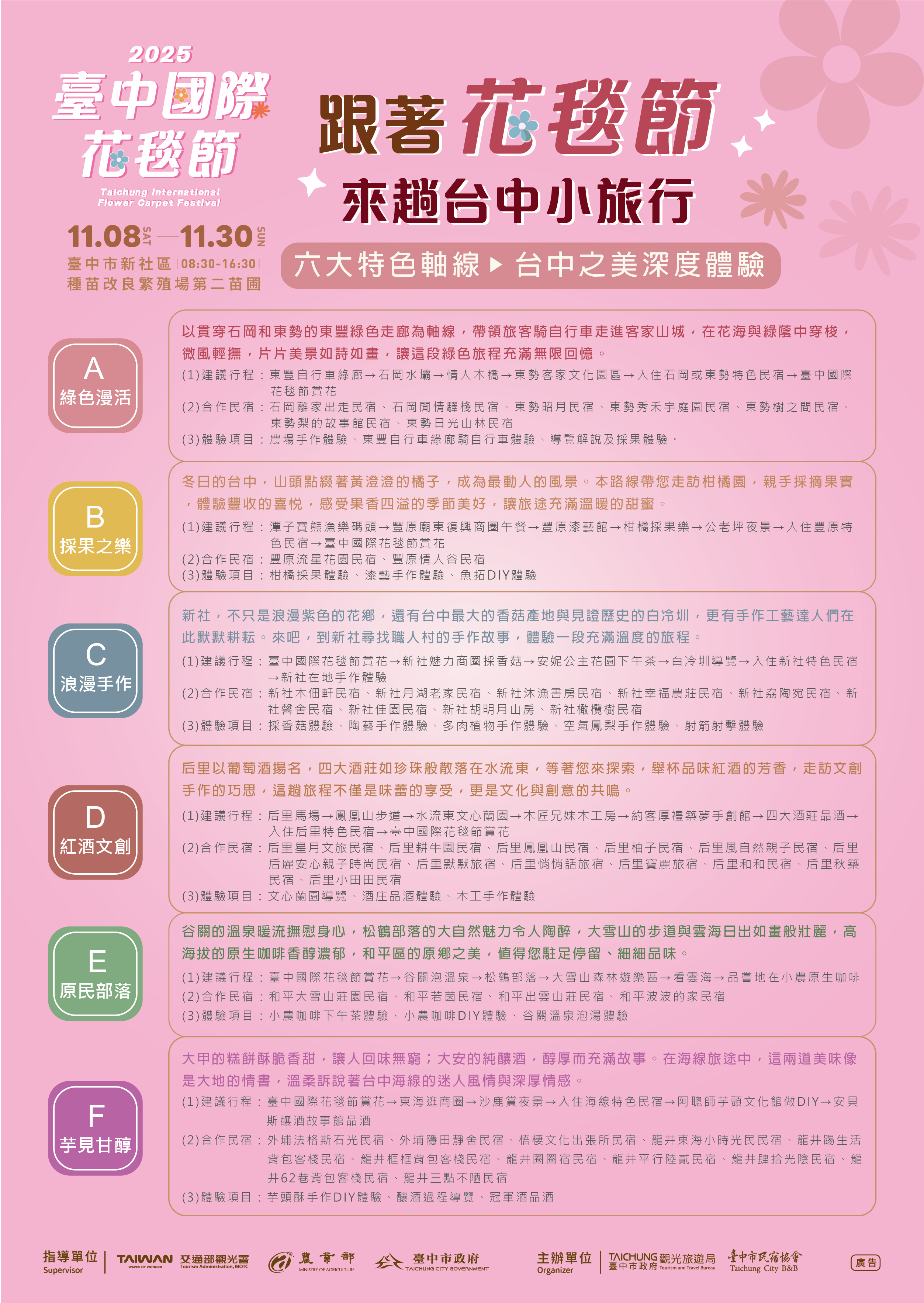 今年台中國際花毯節特別以知名卡通頻道「飛天小女警」為設計靈感,全新打造絕美花毯,以繽紛色彩與童趣造景,呈現夢幻花卉盛宴。新社是台中市內最多民宿申設的轄區,逛完花毯節先別急著回家,不妨選擇在充滿田園氣息的民宿留宿一晚,今年觀旅局與台中市民宿協會及MITSUI OUTLET PARK台中港合作,花毯節期間入住山城及海線民宿即享優惠活動,不僅可至合作店家體驗手作等優惠,並可持MITSUI OUTLET PARK台中港當日不限金額消費發票或銷貨明細,兌換「保溫購物袋 & 店舗超值優惠券」乙份。(限量200份/不累贈)。更多的訊息可至「大玩台中」臉書粉絲團( https://www.facebook.com/taichungresort/?locale=zh_TW )、「台中觀光旅遊網」( https://travel.taichung.gov.tw/zh-tw )或「台中國際花毯節官網」( https://www.flowercarpet.tw/ )查詢。(11/27*10)*觀旅局
