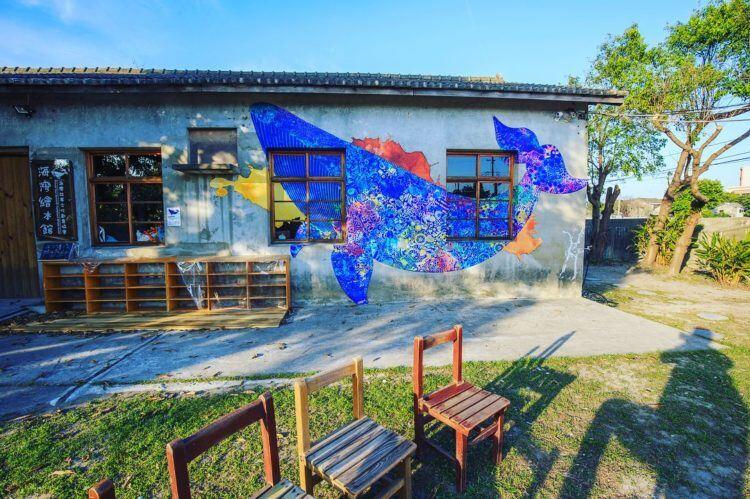 稻田旁的繪本館,牆面上畫了一隻巨大的鯨魚,朝向天空如同要奔向遼闊的世界般,透過繪畫的方式帶大家遊歷海洋世界。館內有一面牆,大量的圖書供旅客參閱,假日偶爾也會有說故事時間、DIY,整個館區屬於老屋再造的藝文空間,提供民眾假日更多不同選擇。